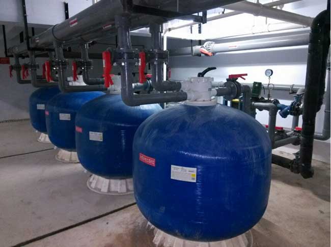 了解更多+游泳池循環(huán)水凈化設備機房應設均衡水池(平衡水池)、循環(huán)水泵、過濾器、加藥裝置、換熱器、消毒設備、藥品庫、控制設備等,并宜按工藝流程順序排列。