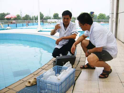 新水放滿后(如當(dāng)天不能放滿的,則在加入清水清殺藻劑5個(gè)小時(shí)以后),投加游泳池消毒粉或游泳池消毒片進(jìn)行消毒,投加量按泳池總水量計(jì)算,每1000立方投入4KG,投加時(shí),游泳池消毒粉請(qǐng)先用水溶解后均勻?yàn)⑷,游泳池消毒片可直接灑入池中?/P>