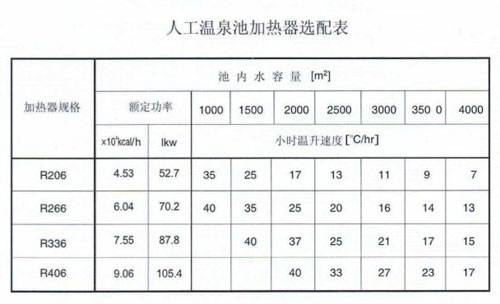 如果你的人工溫泉池還沒有選配加熱器,請先確認你溫泉池的規(guī)格并計算出池內(nèi)水容量,根據(jù)池內(nèi)水容量和你的溫升要求,查下表即可確定加熱器規(guī)格。