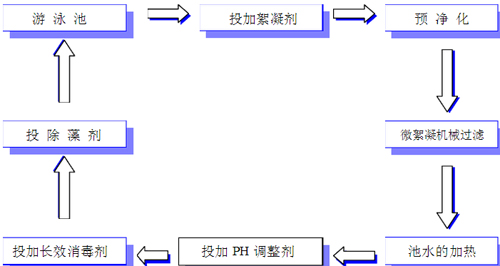 為了滿足人們對(duì)游泳池水質(zhì)越來越高的要求和人們對(duì)水質(zhì)在視覺、嗅覺上的愿望,結(jié)合我公司多年來在全國上百個(gè)工程實(shí)踐中所總結(jié)出的成功經(jīng)驗(yàn),我公司在游泳池水處理系統(tǒng)工藝流程中分為六大部分七大程序。六大部分分別為池水的循環(huán)、池水的凈化、池水加藥和水質(zhì)平衡、池水消毒、池水的加熱、水質(zhì)監(jiān)測(cè)和系統(tǒng)控制:七大程序分別為絮凝劑的投加、池水的凈化、池水的微絮凝機(jī)械過濾、池水的PH值調(diào)整、池水的長效氯消毒、池水的除藻。