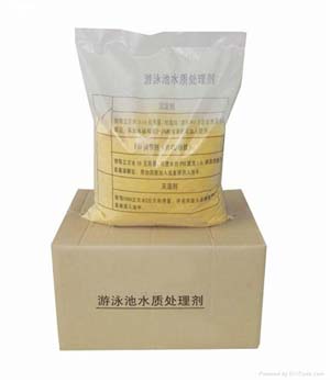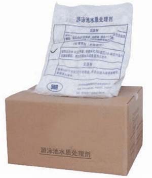 泳池放滿水后,(視水質情況)投放TCCA片劑,速溶片劑按每m32-4g量直接均勻地撇如池水中,藥片沉入池底月15分鐘即完全溶解。放藥時間選擇收場后或早上無人游泳時。正常時間最好在開放前1-2小時加藥。緩溶片劑在循環(huán)系統(tǒng)加藥裝置投加。絮凝劑可依據(jù)水質渾濁度的標準來施放。不符合此標準應投放,絮凝劑一般每星期1-2次。用量沒1000m3水放5-10kg,投放前應測試水中PH值,如PH值偏低(<7)應加PH。