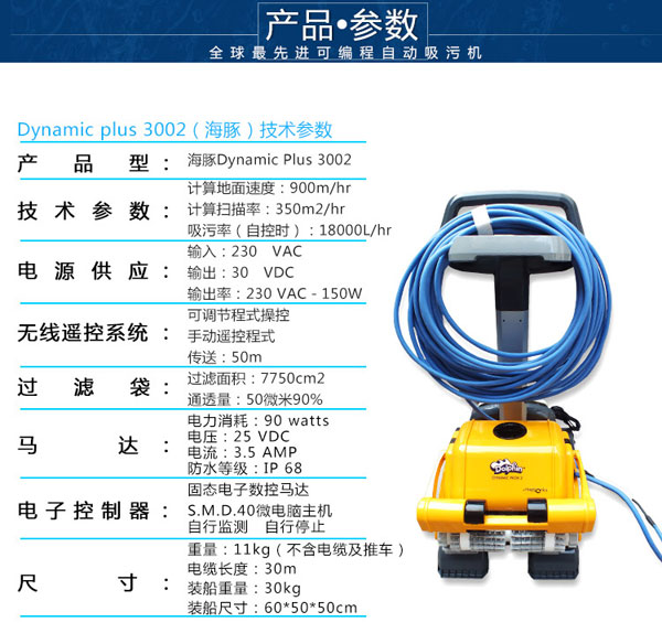 海豚3002全自動(dòng)吸污機(jī),本身設(shè)置有智能程序控制裝,可編程,根據(jù)游泳池的大小設(shè)定不同的模式,具有掃描泳池,鎖定記憶等功能。智能化全自動(dòng)的清潔泳池,靈活方便。不用人工操作,省時(shí)省力。